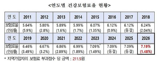 구분 2024년 2025년 2026년 증가액 (2025 → 2026) 직장가입자 158,464원 158,464원 (동결) 160,699원 +2,235원 지역가입자 88,962원 88,962원 (동결) 90,242원 +1,280원 ※ 2023~2025년은 보험료율 동결, 2026년에 1.48% 인상 반영