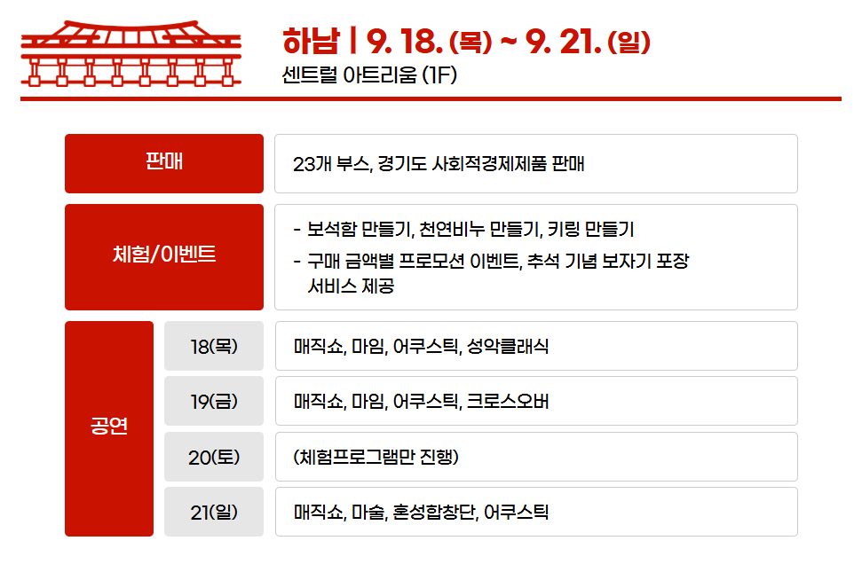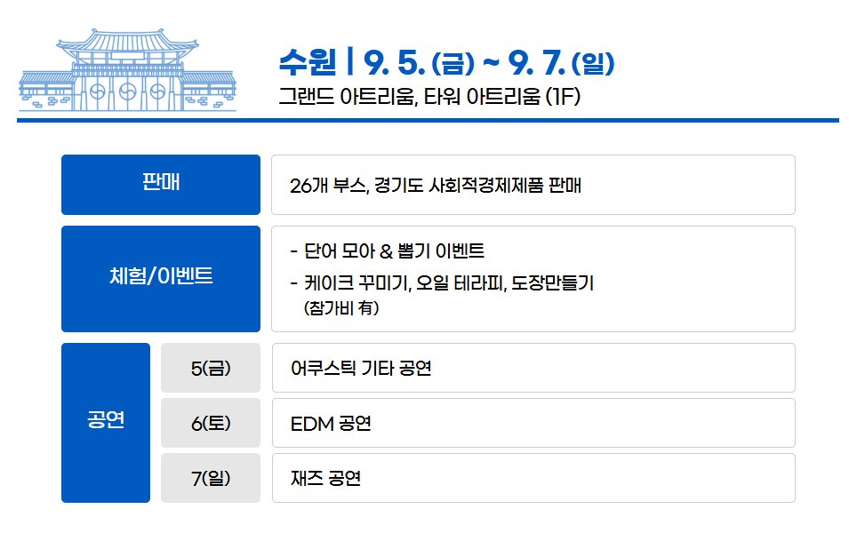 - 수원점에서는 26개 부스가 마련되어 사회적경제기업이 직접 제작한 생활용품과 친환경 제품을 판매한다. 또한 ‘가챠(랜덤 캡슐머신)’ 이벤트와 같은 이색 체험, 레고 만들기, 사진 촬영 부스, SNS 인증 이벤트 등 젊은 세대를 겨냥한 활동이 준비되어 있다.