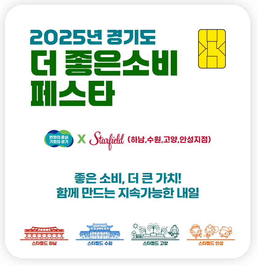 2025 경기도 더 좋은소비 페스타는 9월 한 달 동안 스타필드 수원, 안성, 하남, 고양에서 차례로 열린다. 각 지점마다 특색 있는 프로그램과 다양한 체험 부스가 준비되어 있어, 방문객은 어느 지점을 찾더라도 만족스러운 경험을 할 수 있다.